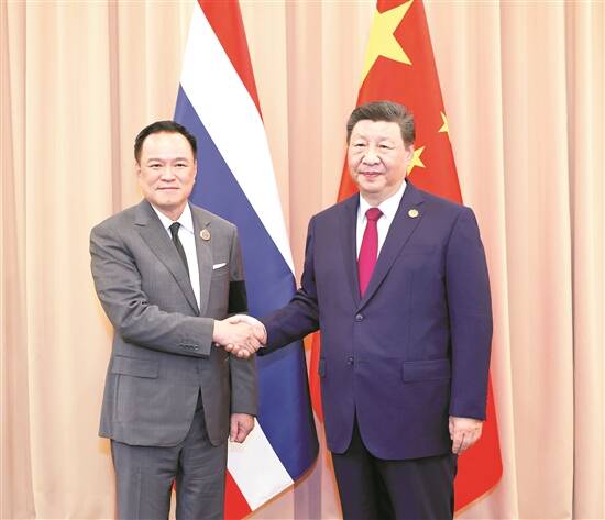 当地时间10月31日下午,国家主席习近平在韩国庆州出席亚太经合组织第三十二次领导人非正式会议期间会见泰国总理阿努廷 新华社发 |