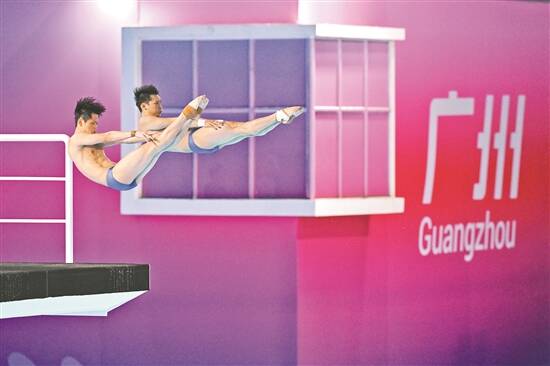 广东队陈艾森/朱子锋组合在男子双人10米跳台比赛中 |