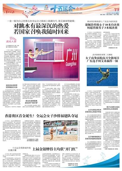 11月8日,十五运会跳水项目在广东奥体中心继续进行,当天分别进行了女子10米台和男子3米板的预赛、半决赛。广东选手谢佩铃、何超成功突围,携手晋级各自项目决赛。 女子方面,广东选手谢佩铃预赛