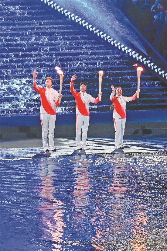 最后一棒点火火炬手是来自粤港澳三地的苏炳添(中)、张家朗(左)、李祎(右) 羊城晚报记者 梁喻 摄 |