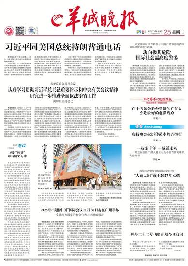 中共广东省委主管、主办 羊城晚报社出版 1957年10月1日创刊 2025年11月25日 乙巳年十月初六 星期二 23℃ 14℃ 责编/林圳 美编/刘栩