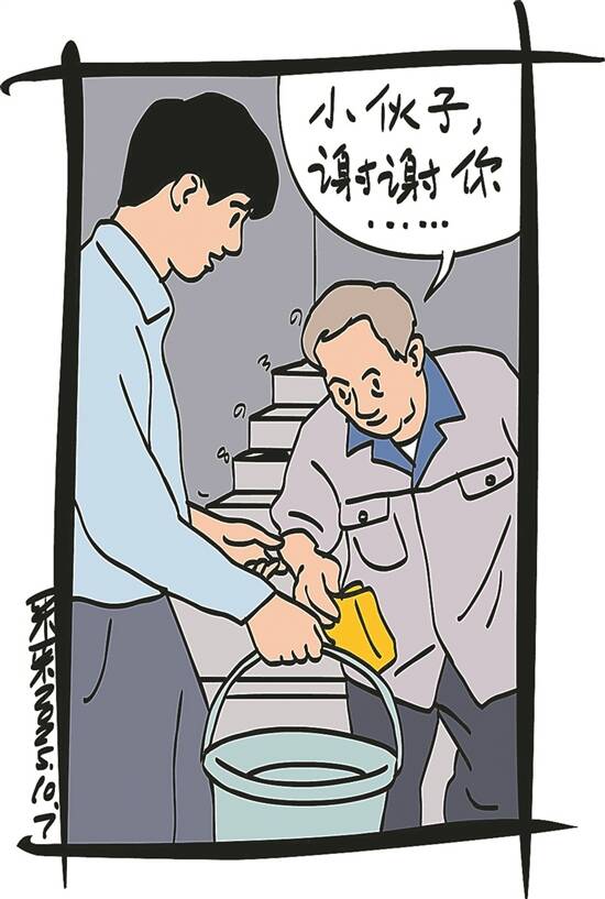 插图:采采 这对刘荣来说不算难事。上学时他常利用寒暑假打工,在工地上搬过砖、扛过水泥,这段时间又跑了外卖,别说10楼,哪怕是20楼,他爬起来也轻松寻常。 当他爬到7楼时,拐角处遇到了一位老人。老人穿着勤杂工制服,头发都花白了,一手拎着洗刷用具,另一手提着一桶水,正吃力地爬楼梯。刘荣看着这身影,不由想起了自己的老父亲,也和这位老人差不多岁数。 他动了情,连忙跑过去,接过老人的清洗工具,又帮他提水。老人很是感激:“小伙子,谢谢你!赶上今天电梯坏了,我负责的区域在10楼,别耽误你的事,你赶快忙去吧。”刘荣笑着说:“没事,不耽误!我正好也到10楼,顺便帮您一下。” 刘荣走得快,先到达10楼,他把东西放在洗刷间,便急匆匆去找总经理办公室。老人赶了上来,在后面喊他:“小伙子,莫要慌!你的包落下了,还撒了一沓花花绿绿的彩票。我给你捡起来了,喏,给你!” 刘荣赶紧回头接过包和彩票,连声道谢,心里却急着面试,怕误了时间。他盯着门牌号一间一间找,老人又在后面喊:“在这边,在这边!” 老人带着他走到一间挂着“总经理办公室”牌子的门前,慢悠悠从口袋里掏出钥匙,打开门后侧身让他进去,笑着说:“爱买彩票的小伙子,请进!恭喜你,你被公司录取了!” 刘荣一头雾水。这时之前的面试官从办公室里走出来,郑重向他介绍:“这是我们总经理,李总……” (刘琪瑞)
