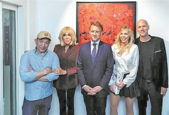 方显秋二儿子方孝当(左一)与马克龙夫妇在A2Z画廊留影 |