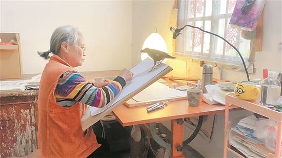 肖大妹在八哥鸟“家旺”的陪伴下创作 |