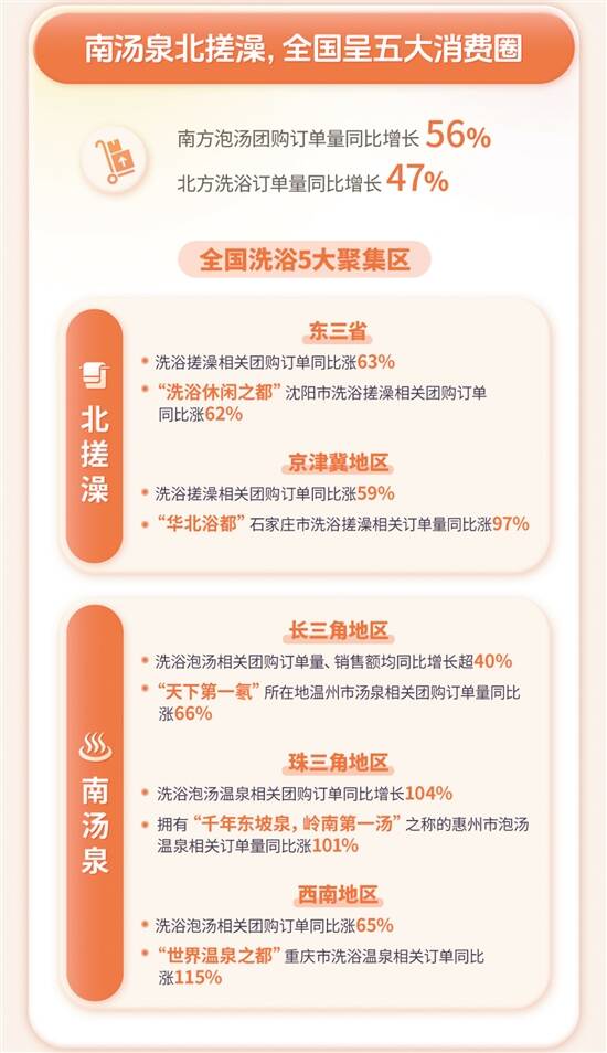 文/王丹阳 图/抖音生活服务 北搓澡,南汤泉。2026年新年将至,以洗浴、泡汤为代表的“暖经济”持续升温。 抖音生活服务最新发布的《洗浴消费报告》(下称《报告》)显示,随着气温转冷,全国洗浴消费热潮涌动,广东“汤泉经济”消费火热。 凭借珠三角消费圈的强劲活力,广东成为南方汤泉消费的绝对核心与增长引擎。线上内容爆发、线下订单激增、“洗浴+”多元业态创新以及年轻人客群的强力驱动,共同构筑了广东冬日消费市场的火热图景,也为区域休闲消费产业的升级与“暖经济”的常态化发展提供了生动样本。 南北共暖“粤”汤泉领跑 《报告》勾勒出全国五大洗浴消费圈——东三省、京津冀、长三角、珠三角及西南地区,各区域团购订单均迎来爆发式增长。从全国格局看,郑州、西安等北方城市稳居下单量TOP5,而深圳则跻身全国五大消费增速最快城市之列,成为南方市场的重要增长极。 其中,广东的汤泉消费呈现出“一城一特色,双核共驱动”的格局。在“千年东坡泉,岭南第一汤”的惠州,依托得天独厚的优质天然温泉资源,相关订单量同比暴涨101%,成为以资源驱动消费的典型代表。而在创新之都深圳,汤泉业态则朝着年轻化、时尚化、综合化方向疾驰,通过丰富的场景设计和多元的产品组合,吸引了大量年轻客群及跨境消费的香港游客,与惠州共同构成了驱动珠三角洗浴消费圈增长的双引擎。 广东本地的消费热力从线上到线下全面传导。《报告》数据显示,11月1日至12月10日,抖音平台洗浴泡汤相关内容数同比上涨43%,分享量同比激增52%,其中广东区域相关内容贡献度显著。 这股线上“种草”热潮,直接转化为强劲的消费意愿。平台数据显示:广东洗浴、汗蒸相关团购订单量同比大涨超38%,销售额同比增幅达50%,且自11月以来,下单用户人均洗浴或泡汤达2次,频次位居南方省份前列,显示出“泡汤”已从偶发性体验,内化为广东消费者冬季周期性的休闲习惯。 “洗浴+电竞”火热出圈 区别于传统洗浴单一的功能定位,广东市场的洗浴消费正经历一场深刻的场景革命,“一站式休闲综合体”成为行业进化方向,“洗浴+”组合业态成为拉动增长的核心引擎。 报告显示,全国范围内“洗浴+餐饮”“洗浴+住宿”等组合业态持续升温,而广东的表现更为亮眼:本地“洗浴+X”团购销量同比增长126%,销售额同比增长90%,远超全国平均水平。 细分来看,广东热门“洗浴+X”组合呈现年轻化、场景化特征。其中“洗浴+住宿”订单量同比暴增2148%,“洗浴+电竞”增长964%,“洗浴+亲子乐园”增长522%,“洗浴+餐饮”“洗浴+健身”增速也均超100%。这种业态创新精准匹配了广东年轻群体的社交需求,让洗浴场所从单一沐浴空间,升级为朋友聚会、家庭休闲、公司团建甚至商务接待的多元据点。 社交属性的强化直接推动多人消费爆发。广东抖音平台多人(≥2人)洗浴按摩订单量同比大涨145%,销售额同比增幅达165%,远超全国28%的订单增速和46%的销售额增速。在广东热门汤泉场馆中,常常能看到年轻人三五成群围坐休闲,或家庭亲子共享时光的场景,“泡汤社交”已成为广东年轻人的冬日休闲新潮流。 90后成“汤泉经济”消费主力 年轻群体是驱动广东汤泉消费爆发式增长的核心力量。《报告》显示,全国范围内90后为洗浴消费主力军,24-30岁、31-40岁用户下单量占比分别达29%、37%,而00后消费增速最快,18-23岁用户下单量同比增长55%。这一趋势在广东尤为明显,深圳、广州的汤泉场馆中,20-40岁用户占比超六成。 线上种草与直播带货成为连接年轻消费者与商家的关键纽带。报告显示,全国达人直播带货订单量同比增长38%,短视频带货订单量同比增长23%,而广东商家的线上经营成效更为显著:抖音平台#广东温泉 话题播放量超4816万次,#广东温泉攻略 播放量超890万次,#广东温泉推荐 播放量达1122.1万次,海量线上曝光为本地温泉商家精准引流;在此带动下,本地洗浴按摩商家通过短视频带来的GMV同比增长109%,直播GMV增幅高达250%。 广东本土洗浴品牌正从区域走向全国。抖音生活服务发起的“洗浴季”活动,联合全国超过2万家商家共同激活冬季消费市场,使得“上抖音,去泡汤”从一句口号,逐渐成为广东乃至全国用户的冬季休闲消费共识。为精准营造南方洗浴消费氛围,助力线下消费活力释放,抖音生活服务推出抖音生活洗浴季暨南方按摩节专项活动。数据显示,活动带动下,南方地区 “洗浴按摩” 相关品类近 30 天在抖音平台的交易规模同比增长 147.8%,实现消费热度与市场活力的双重攀升。 乐游广东“暖经济”正升级 广东汤泉消费的不止于“暖”,还与文旅大省广东促消费、兴文旅的战略同频共振。当前,广东正深入开展“粤享暖冬 乐游广东”冬季促消费活动,汤泉消费的升温与之形成了有机联动和相互促进。 面对市场需求的变化,广东各地的温泉商家积极加码特色化、体验化内容。中医理疗、非遗艾灸、节气膳食等融合了健康、文化与休闲元素的融合产品。市场反馈热烈,部分热门温泉度假村的元旦假期预订量已超过八成,显示出强大的消费潜力。广东正以汤泉为支点,撬动休闲消费、文旅体验、民生服务的多元升级。 从产业视角观察,广东洗浴消费的爆发,其意义已超越单纯的季节性“暖经济”范畴。以汤泉为支点和接口,产业链正在横向拓宽、纵向深化:“洗浴+文旅”带动了周边景