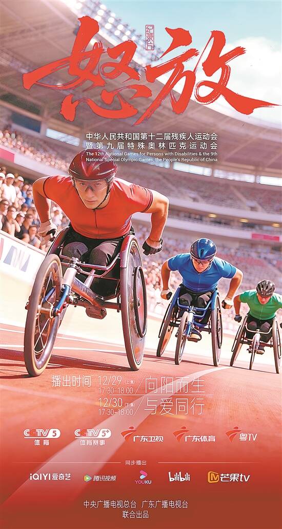 羊城晚报讯 记者柳卓楠报道:12月29日和30日17时30分,残特奥会纪录片《怒放》将连续两天在央视体育频道、广东体育频道、粤TV重磅上线,广东卫视、爱奇艺、腾讯视频、优酷视频、芒果TV、B站等多平台同步播出,敬请收看。 12月8日至15日,全国第十二届残疾人运动会暨第九届特殊奥林匹克运动会在粤港澳三地举行。这是首次由粤港澳三地联合举办的全国性残疾人体育赛事,7000多名运动员在赛场内外,用拼搏定格感动瞬间,演绎出与命运抗争的励志传奇。 纪录片《怒放》分上下两集,每集30分钟,通过典型人物故事、精彩赛事回望,将本届残特奥会的热血与温情娓娓道来,串联起三地同心、残健共融的美好图景。 其中,上集《向阳而生》聚焦赛事核心参与主体,如全盲运动员杨晓婷、单腿球王何忆义、九金王蒋裕燕、新疆盲人足球队等代表人物和群体,以“向阳”呼应残特奥运动员不惧不屈、勇往直前追求梦想的信念,弘扬中华体育精神,传递体育的力量。 下集《与爱同行》,则将视角从残特奥会的竞技赛场延伸至幕后,聚焦为运动员逐梦提供支撑和保障的群体,如志愿服务、科技助残、场馆无障碍改造、辅具服务保障等团队,展现幕后工作者的坚守担当,凸显责任与热爱交织的支撑力量。