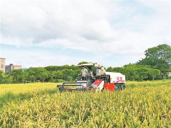 汕头潮阳,农机手正在收割水稻 羊城晚报记者 赵映光 通讯员 李盛和 摄