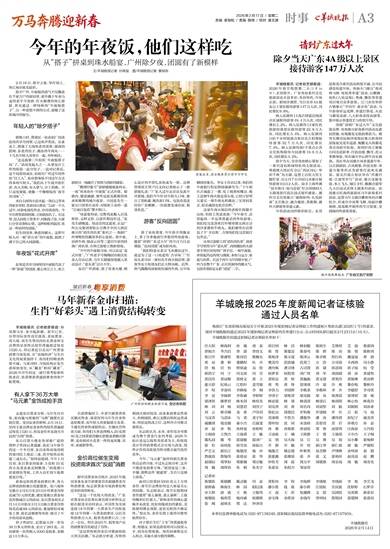 羊城晚报讯 记者易芝娜报道:2026年春节假期第二天(2月16日),正值除夕。广东各地系列文化旅游活动丰富多彩、各具特色,年味正浓。据初步测算,当日全省4A级及以上景区接待游客147万人