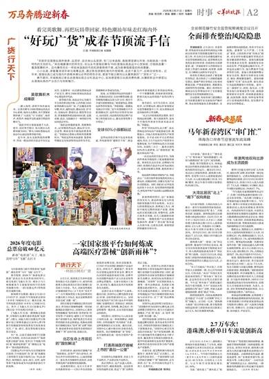 2月19日(正月初三),港珠澳大桥双向车流量突破2.7万车次,刷新大桥通车以来单日历史纪录,再创新高(此前纪录为2025年正月初四的2.66万车次)。今年春节假期前五天(腊月廿八至大年初三)大桥车流量达10.46万车次,日均约2.1万车次,与去年春节同期相比增长24.49%。 当前,“港车北上”“澳车北上”和“粤车南下”等政策红利持续释放,叠加春节期间粤港澳三地跨境度假、探亲访友、商务往来需求,港珠澳大桥成为大湾区越来越多民众跨境出行的重要通道。去港澳看花车巡游、烟花表演等,来广东体验非遗年俗、迎春花市等,大桥让湾区“一小时生活圈”的便利直达人心,双向奔赴、一路畅游的热潮折射出湾区融合发展的强劲活力。 (王丹阳 粤交综)