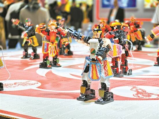 身披“战袍”、手持棒槌的桌面小机器人踏着鼓点跳起英歌舞(资料图) 羊城晚报记者 赵映光 摄 |