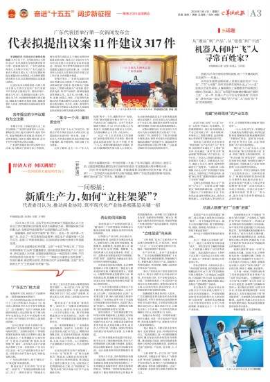 羊城晚报讯 特派北京记者柳卓楠报道:3月3日下午,十四届全国人大四次会议广东代表团在住地首都宾馆举行第一次新闻发布会。广东代表团新闻发言人李翔宇介绍了广东代表团代表在十四届全国人大三次会议期