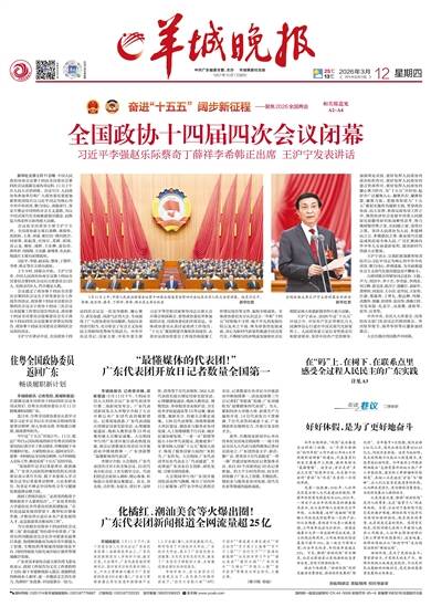 中共广东省委主管、主办 羊城晚报社出版 1957年10月1日创刊 25℃ 13℃ 2026年3月12日 丙午年正月廿四 星期四
