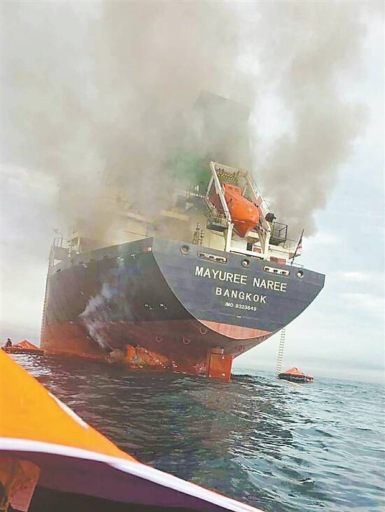 一艘泰国货船在霍尔木兹海峡海域遭袭起火 新华社发 |