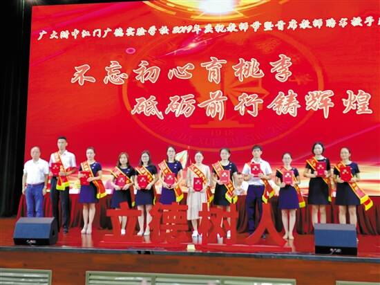 9月9日,广大附中江门市广德实验学校举行了第35个教师节表彰大会(见上图),表彰教育教学突出贡献的优秀集体和先进个人,授予教学骨干首席教师、首席青年教师的聘书。2019年的中考、高考,该校首届初三、高三分别获中考蓬江区第一名和“高考成绩特别贡献奖”。