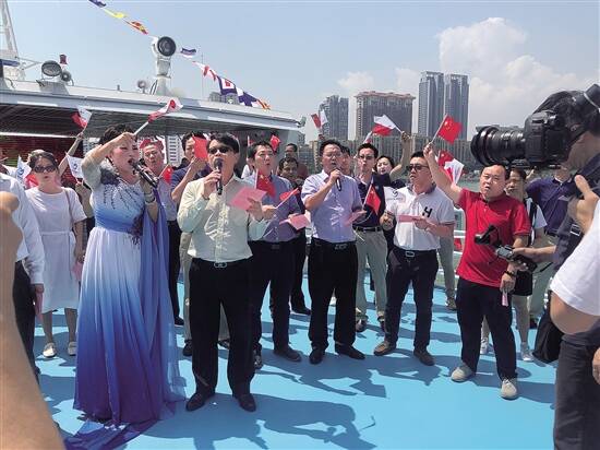 国庆即将到来,当天,参与首航仪式的市民们来到甲板上,在蓝天碧海的映衬下,以港珠澳大桥为背景,众人合唱《我和我的祖国》《歌唱祖国》等歌曲,歌声壮阔,冲击人心,氛围热烈、喜庆。