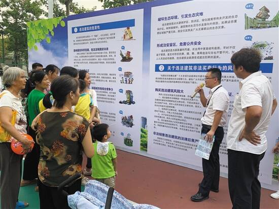 近日,龙华区大浪街道深入7个社区开展以“打击违法建设行为、全面提升城市品位”为主题的查违宣传进社区活动,倡导全民参与打击违法建设行为,共同努力打造美好家园。活动现场,执法人员向市民派发了宣传资料,引导大家观看违建典型案例视频和图文并茂的宣传展板,现场普及违法违规建设的类型和危害、参与违建所需承担的法律责任、违建监督举报途径以及查违相关政策法规等知识,并对大浪查违举措成效进行广泛宣传。活动吸引了大批市民群众驻足观看和参与,截至目前,大浪街道已悬挂横幅40余条,张贴海报80余份,发放宣传资料900余份,接受群众咨询600人次。
