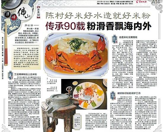 羊城晚报讯 记者欧阳志强报道:今年4月18日,羊城晚报正式开设《寻味佛山》栏目,首期报道《陈村好米好水造就好米粉 传承90载粉滑香飘海内外》一经推出获得社会各界广泛好评,并被作为陈村镇申报市级非遗的材料之一。时至今日,陈村粉入选第七批市级非遗项目名录。佛山是一座富有美味的城市。食之唇齿,味落心间。从美食出发,跟随着名厨的脚步,去了解这方水土的过去、现在和未来……羊城晚报佛山地方版自推出栏目《寻味佛山》以来,连续推出数十期美食报道,其中《陈村好米好水造就好米粉 传承90载粉滑香飘海内外》一文为开篇之作,受到了顺德区陈村镇党委、政府高度重视和肯定。
