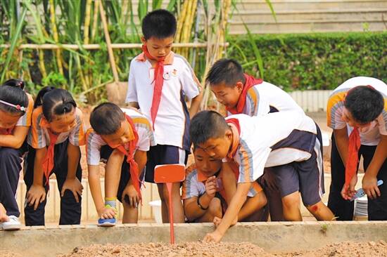 该校校长谢慰意介绍,虽然大家都知耕田基本步骤,但是怎样把农耕知识讲得浅显易懂却是个难题。因此,学校聘请了后勤人员担任各班劳动教育辅导员,大家一起研读种植和劳动教育方面的书籍,并确定了劳动教育的内容:一、二年级以认识花草树木、蔬菜名称为主;三、四年级学习种植的基本过程;五、六年级学习播种、移植、施肥、防虫等整套劳动技能。