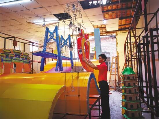 “制作彩车包含了设计、开样、扎作、安装灯泡、扪布、装饰、安装LED灯管、组装等多道工序。因为底架要坚固,一辆彩车重达数百公斤,巡游时需要6到8个人来推。”杨小燕告诉记者。