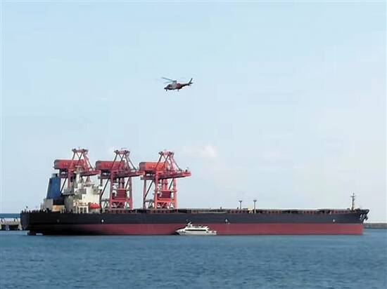 随后,模拟处置大煤船“南鑫5”船艏右舷搁浅。在演习人员的指挥下,应急勘测船“梦之蓝号”首先对搁浅大煤船水下进行应急勘测,第一时间掌握搁浅船只附近海域地形地貌数据,为应急指挥部科学决策提供详细的数据支撑。随后,“金浪”“银通”轮乘高潮位顶推“南鑫5”,顺利协助该船成功脱险。
