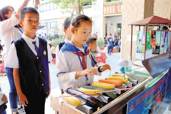 禅城东鄱小学的学生们带来了智能节气走马灯、水果钢琴等作品。其中,智能节气走马灯是一款结合了语文、物理、数学、美术、信息技术等多学科知识设计制作而成的作品。只要站在灯前说出节气的名称,走马灯就能将此节气图案转到灯的正面,并且进行解说。