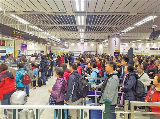 羊城晚报讯 记者宋王群、通讯员黄钊摄影报道:连日来,赴内地短途旅游成为香港居民周末休闲新选择,深圳湾口岸接连迎来入境客流高峰,以香港居民为主的大批入境旅客“挤爆”深圳湾口岸,深圳湾边检站多措并举,确保旅客顺畅通关。据了解,受天气晴好等因素影响,深圳周边地区温泉度假、观光游览、探寻美食等旅游项目深受香港居民喜爱。加之成团出游价格实惠,吸引了不少香港市民周末举家或携伴赴内地游玩,深圳湾口岸也接连迎来了入境客流高峰,且呈现出高峰时间段集中、客流增长迅猛等特点。