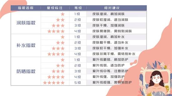 据悉,该指数主要包含润肤、补水、防晒三项指导,其中“润肤指数”源自皮肤的代谢状况与气温、风速、相对湿度的分析,补水指数则由皮肤与气温、风速、相对湿度、风向的关系分析而来,而防晒指数则与气温、云量、日照以及海拔高度有关,这些指数都由专家团队根据先进的智能化格点预报数据或通过分季节计算模型计算得出。