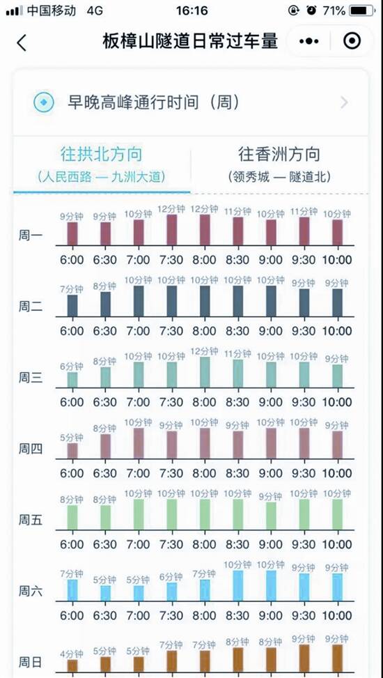 以板樟山隧道日常过车量作为例子。点开早晚高峰通行时间(周),会显示上一周经板樟山隧道往返拱北、香洲的通行时间柱状图。柱状图上方可以选择方向,往拱北或是往香洲,下方可以选择早高峰或晚高峰。图中的通行时间既是上周通行时间的平均值,也是对未来一周通行时间的预测,司机可以参考通行时间,预测上班路上拥堵时间。采取错峰、绕行等方式往返拱北、香洲,避开板樟山隧道的拥堵,也可以参考最上方的出行建议。而实时路况视频截图就是系统截取板樟山隧道南、北两侧往返拱北香洲最新的路况截图,大家可以根据实时路况调整出行路线。