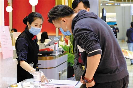 就餐时间,在华贸负一楼费拉拉,食客进店前,需要接受体温监测,登记个人信息,扫码获取运动轨迹,经核实后才可进入,进店后需隔座就坐。