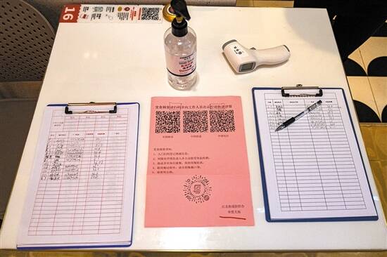 餐饮店门口摆放的信息登记本、体温计及消毒水