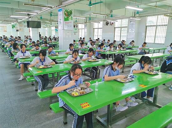 据悉,寮步各中学均采用了"错峰错时、定位就餐"的方式,所有学生需间隔一米排队,并固定座位用餐。此外,学校严格执行食堂就餐卫生安全管理制度,做到“一人一餐具、一用一消毒”,并加强食堂从业人员健康管理和排查,规范食品原料送货渠道,做到预防第一,保障健康平安。