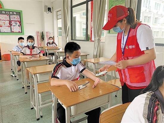 到达学校后,工作人员将保温周转箱配送至每间教室,同时学校负责人对营养餐以及样品进行签字验收。11时50分左右,记者到达南城阳光第六小学六年级班级时,生活老师正准备为学生分发午餐。在分发午餐前,生活老师要为每一名学生测量体温并进行记录。在打开保温周转箱之前,生活老师会检查周转箱上的封条,确认完好之后再开启。餐食分发完毕,生活老师还为每名学生发放了消毒湿纸巾。