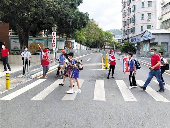5月11日,宝安区石岩街道第二批返校复课中小学生挥别“加长版”寒假,重新回到阔别已久的校园。当天,由115名教师义工、家长义工组成的“暖心护航”队伍也早已投入到校园内外的岗位服务中,为辖区学校复学复课注入志愿力量。上午7点,在通往罗租小学的几个主要路口,身着红马甲的义工们早已就位,手持交通指示旗,引导过往车辆文明礼让,劝导学生不聚集逗留,有序上学。“请同学按照地面标识排好队,对准测温仪。”在校门口,家长义工郑洁正在维持秩序,提醒返校学生养成“戴口罩、勤洗手、不扎堆”的习惯。遇到低年级的学生,郑洁更是细心引导,直到学生安全进入校园。