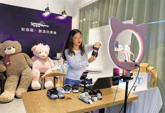 “这双黑色的童鞋,是今年夏季的新款。”偌大的产品展销间里面,四季熊(东莞)文化传播有限公司(以下简称“四季熊”)的销售人员变身靓丽女主播,正在四五部手机前卖力地直播带货。从4月开始,每天的16点-22点,四季熊都会安排两个主播轮流进行直播销售,星期一到星期天不间断,每逢周末还会举办特价货品直播促销专场。