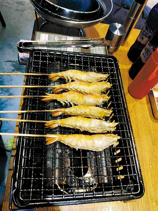 店员在为顾客烤制罗氏虾