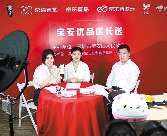 5月18日19时至21时,宝安区联合京东、京喜双平台,开展“宝安优品区长送”直播活动,区长郭子平、副区长娄岩峰现身直播间,为宝安优质产品直播带货,在直播的两小时里,销售量达到4000万元,活动当天销售量达到5045万元。在两小时直播里,郭子平、娄岩峰对韶音骨传导耳机、卡士奶、创维4K全面屏电视等宝安产品进行了详细介绍,其中还有以Insta360运动相机为代表的高科技产品,以及以黄田桂味荔枝为代表的宝安特色食品,“宝安天生丽质难自弃,宝安出品的既有‘黑科技’产品,也有诱人美食,大家要趁此实惠买回家” 。