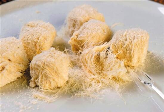 首先介绍一款来自安徽安庆市的特色甜食——龙须酥,又名银丝糖或龙须糖。它以麦芽糖、小麦精粉等为原料,经过七道工序拉丝而成,馅料包括白砂糖、花生、芝麻、椰蓉等。外观像千条洁白的银丝包裹而成,口感绵软清甜,入口即化,后传入宫廷成为宫廷甜点。相传因其外观别具特色,由当时执政的正德皇帝重新起名为“龙须酥”。