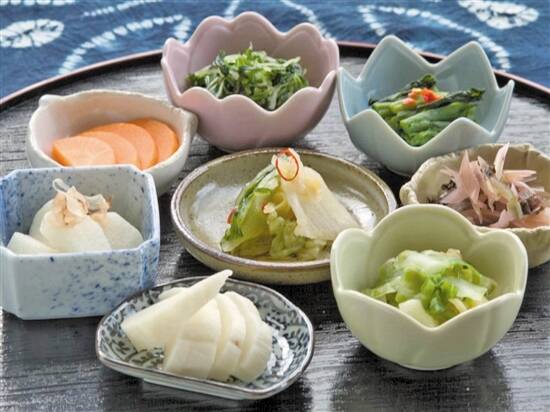 渍物即日本的腌制品,在制作过程中通常伴随着发酵。用盐、醋、酒糟、味噌等腌渍食材,除了可以延长保存时间,也可以获得食材本身不具有的风味。