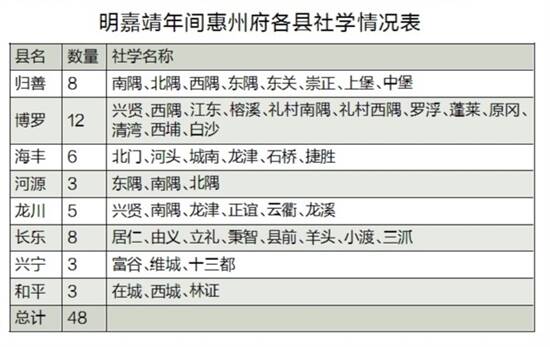 社学是一种在乡村设立的初等学校,与近代的小学相似,主要对儿童实行启蒙教育。从现存资料看,惠州乡邑大张旗鼓办社学,大概始于嘉靖初年,当时魏校任广东提学副使,崇儒学而斥佛老,惠州城乡各地的寺庙被改建为社学书院。清光绪《惠州府志》载,明嘉靖元年惠州府缴纳赋税的在册人口为123270,而全府社学有48间,社学的人均占有率颇高。