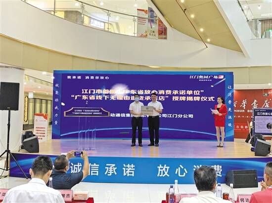 羊城晚报讯 记者陈卓栋,通讯员黄婧、谭耀广摄影报道:23日上午,江门对首批“广东省放心消费承诺单位”和“广东省线下无理由退货承诺店”(下称“双承诺单位”)进行授牌。记者了解到,江门首批“双承诺单位”共58家,其中40家为“广东省放心消费承诺单位”,其余18家为“广东省线下无理由退货承诺店”。