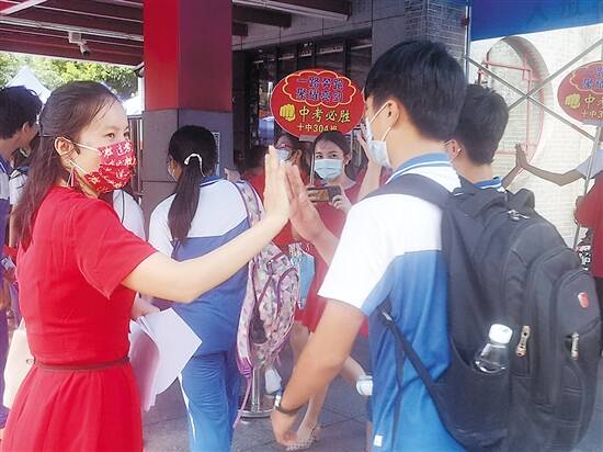 除了家长,老师们也早早守候在各考点外。在佛山市第三中学门口,老师们身穿红色的助威服,戴着写有“中考加油”的红口罩和前来考试的考生们一一击掌。记者还了解到,在考生出发前,不少学校除了准备各式加油标语,还搭建起了寓意高中的“状元门”,甚至有学校请来了舞狮队。