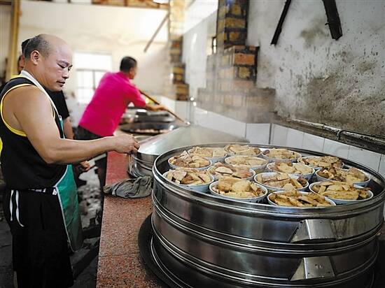大锅中的菜品就有客家焖猪肉、客家蒸鹅、客家香芋扣肉。据叶伟池介绍,猪肉先用白糖、酱油、米酒腌制,再在大锅中炒至金黄,最后放入豆腐焖制40分钟左右,一道肉色红亮、质地柔软、汤汁油润的客家焖猪肉便大功告成。蒸鹅则需要在油锅中炸10分钟左右,再抹上特制的调料上锅,隔水蒸60~80分钟。
