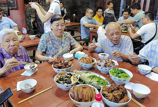 “客家菜中,猪肉和蒸鹅是不可少的,每逢清明、重阳、春节等重大传统节日都会拿来祭祖,体现对祖先的敬畏,以客家香芋扣肉为例,即使在生活艰难的时候,也有规制要求,要一碗5两,现在则随着生活水平提高,每碗达到1斤猪肉;而蒸鹅则要求9斤一只。”此时,叶伟池正蹲在一大盆蒸鹅旁边,满头大汗,给蒸鹅灌汁,让蒸鹅去味入香,调味入口,然后将其周身涂抹均匀,静置10多分钟后,色泽金黄、外焦里脆的客家蒸鹅便可上桌。此时,在宗祠厅堂,族人们将其余几道客家菜,分别盛进大海碗里,一一端上桌,族人们按照尊老爱幼的传统,分批入席,拉家常,话过往,起坐间,其乐融融。