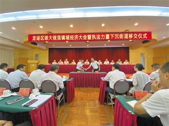 上述大会召开两天后,8月9日,作为汕头经济特区发祥地的龙湖区举行区级大会,将545项区级职权正式下放到各街道,并向街道移交执法队伍,赋予街道综合执法的主体地位。