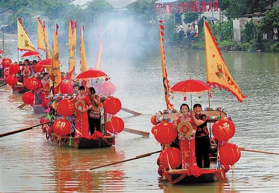 “斗门水上婚嫁”是斗门水乡一种流行了几百年的传统民俗,作为珠海市第一个国家级非物质文化遗产,一直是斗门区弘扬中华优秀传统文化的一张亮眼“名片”。其主要特征是婚嫁过程形式繁复多样,讲究礼仪,有着比较固定的程序和约定俗成的礼仪物品,也与沙田民歌有不可分离的联系。