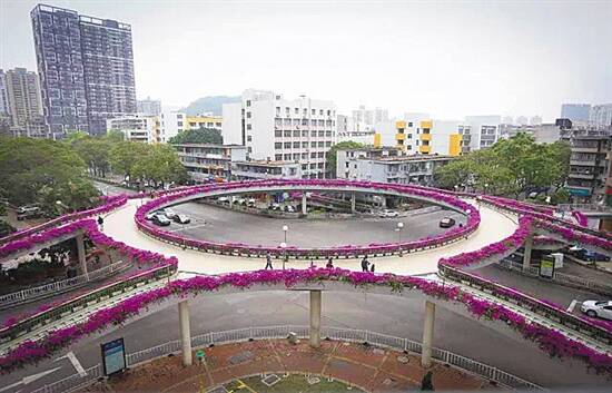 特别是在春天里,凤凰北天桥上的簕杜鹃都会开得格外热闹。环绕天桥一圈,满眼都是粉嫩一片,它打破了这个枯燥乏味的城市的沉默,成为一道亮丽的风景线。满是簕杜鹃的天桥立体高耸,在城市的繁忙路段中犹如七彩绸带一般,为这座城市带来生机与活力。