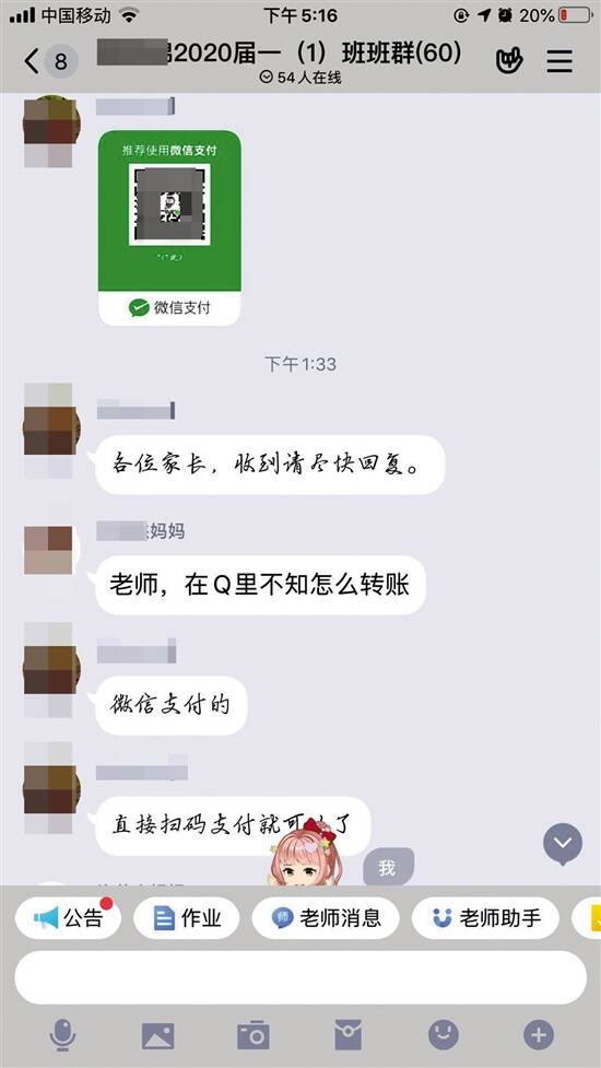 另外,“蔡老师”还贴心地附上了微信付款码,提供统一代收款、为家长落实登记转账付款记录的服务。李先生见对方的QQ头像和名字确实是“蔡老师”,而对于学校方面新学期换新校服的做法也比较理解。于是,在看到其他几位家长都交纳了校服费后,自己也没有仔细分辨,用微信扫码支付了315元。
