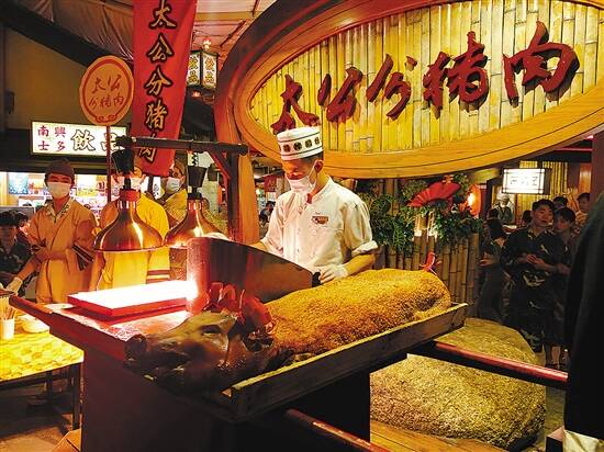 一路走来,有用竹简熬煮的竹筒饭,糯米饭香飘香数米;用大锅翻滚着浓汤,客人可以随意挑选肥牛、肥羊等食材,食用滋补火锅;一座偌大的明火炉,里面排放着一颗颗手掌般大小的生蚝,烤得滋滋入味;师傅用手工现切生鲜三文鱼刺身,炸天妇罗的香气溢出街头……