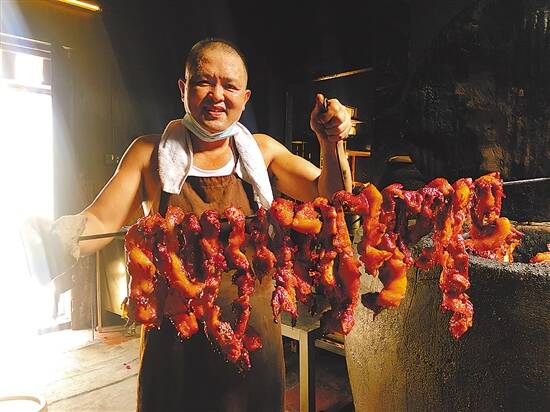 一束阳光通过天窗倾斜地洒在瓦缸上,瓦缸下燃烧着荔枝木飘散出阵阵果香。通过室内风流的设计,荔枝木燃烧产生的烟雾被吸进瓦缸底部,一百多斤的叉烧和排骨,刷刷地沐浴着果香和阳光。近20分钟的“果木香薰浴”后,大名鼎鼎的“大赤坎叉烧排骨”热腾腾地出炉了。
