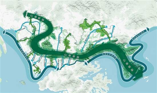 “一带”滨海蓝带,由深圳河连接,从东到西串联大亚湾、大鹏湾、深圳湾和前海湾以及珠江口,形成汇聚海湾、半岛、湿地、沙滩的东西滨海蓝带,打造丰富多彩和极具活力的滨海生活带。八条“山廊”连通主脉之外的众多独立小山体,构建连通山脊与海岸带的生态廊道。十条“水廊”依托山海间的自然河流,提供深入城市中心、串联精彩文化活力体验的廊道。